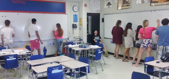 6. Classroom organization: I have put a lot of thought and a pretty good amount of research into how I set up my classroom. The most important aspect of my classroom is the whiteboard on every wall. The picture shows my students working at the whiteboards during class one day.Notice that all the students are involved.