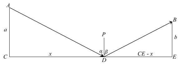 \displaystyle \frac{x}{{\sqrt{{{{a}^{2}}+{{x}^{2}}}}}}=\frac{{\left( {CE-x} \right)}}{{\sqrt{{{{b}^{2}}+{{{\left( {CE-x} \right)}}^{2}}}}}}
