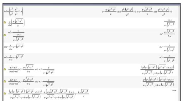 • The fourth and fifth lines are the slopes, m1 and m3, are the slopes from the point on the ellipse to the foci. The “such that” bar, |, indicates that what follows it is substituted into the expression.