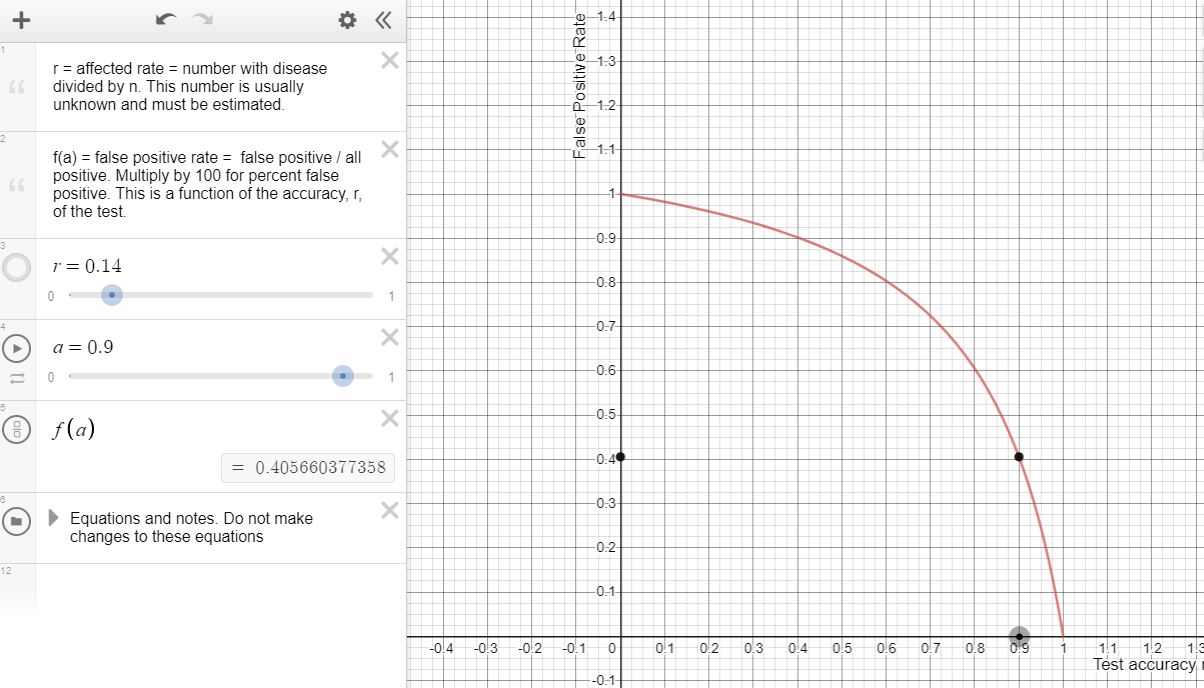 To examine the false positive rate, you may use this Desmos graph. Use the r-slider to adjust the proportion of the population that is believed to be affected. Use the a-slider to change the accuracy of the test. The number given by f(a) is the false positive rate.