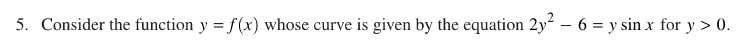 While not required for the exam, you could use a grapher in implicit mode to graph the relation. Without the y > 0 restriction the graph consists of two seemingly parallel graphs similar to a sine graph. They are not sine graphs.