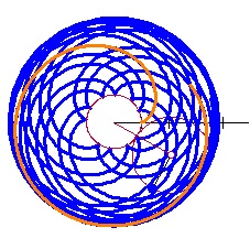 Now the circumference of the larger circle is not a multiple of the circumference of the smaller. To return the circle to its starting orientation we have to go around once more by letting t go from 0 to . The first time around (from 0 to