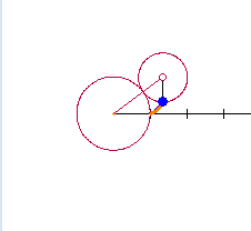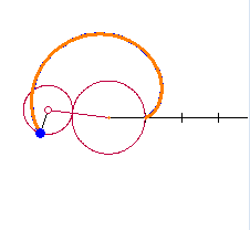 Let’s see what happens if we make the moving circle smaller. Make R= S = ½. Now the radius of the moving circle is one-half the radius of the fixed circle. The circumference is also half the circumference of the fixed circle. The smaller circle makes two rotations in going once around the larger circle before returning to the initial orientation.