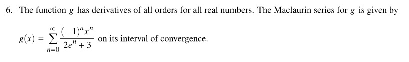 Part (d): Students were asked for the alternating series error bound using the first two terms to approximate the value of g(1). Even though there are only two error bounds students are expected to be able to compute (the other is the Lagrange error bound), students were again told which one to use. The result was not expected to be expressed as a decimal.
