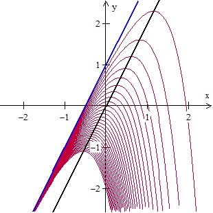 The graph above shows 30 members of the family with C = –3 (bottom curve) to C = –0.1 (top curve). The equation of the black line is y= 2x and the equation of the blue line is y= 2x + 1. Note that all the maximum points lie on the line y= 2x.