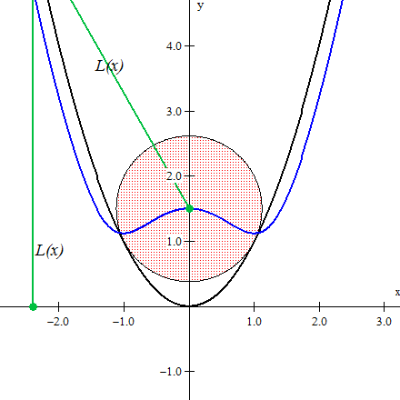 The clip below illustrates the situation. The two segments marked L(x) are congruent. The graph of y = L(x) is a“w” shape similar to but not quartic polynomial. The minimums occur directly under the points of tangency of the circle and the parabola. The local maximum is directly over the origin. Is it coincidence that the graph goes through the center of the circle? Explain.