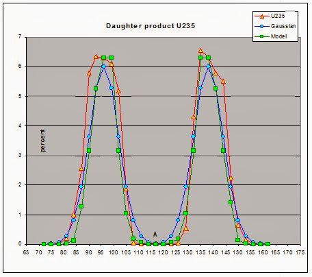 “[Figure 9 below] shows the percentage of fission products by [atomic] mass[, A].  [This is] called the Mae West curve. … Note that the more likely fission products have two peaks at a mass of about 95 and 135.”